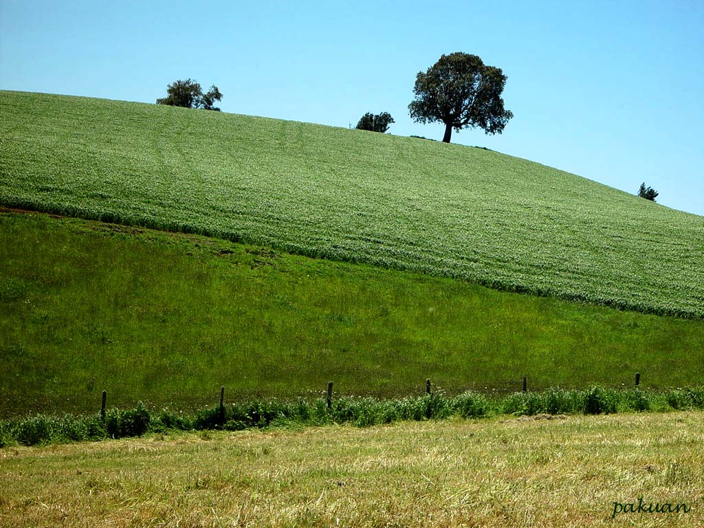En lo alto de una verde pradera, sentado y de espaldas, mirando al mar azul en su completa inmensidad, con el sol naciendo fuerte y vigoroso, tras la huida de la noche, dorado metal el que le da ese vivaz color, detrás de mi veo el tronco de un árbol, alto fuerte, y frondoso en su copa, es de un verde muy oscuro, contrastando así con el suelo, incluso con el ocre de su suelo, en las pequeñas calvas de imperfección que este perfecto paisaje denotan.