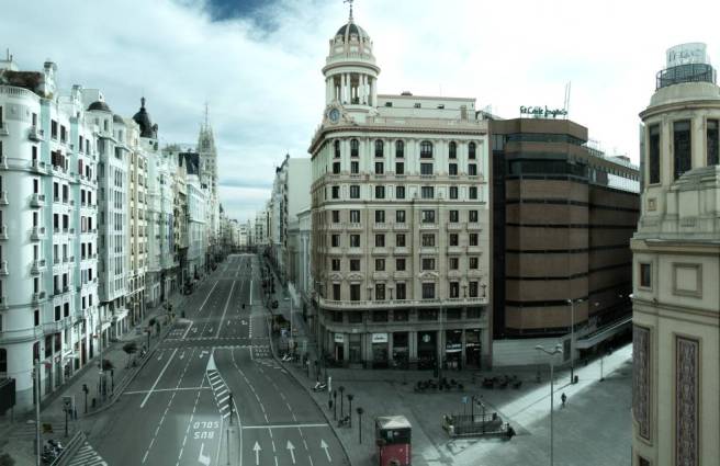Tenemos a Madrid en cuarentena, escondida de los vientos en una urna de hielo, y al salir, nuestra mirada atraviesa la calle sin tropiezo. Existen guerreros con laurel, bata y mascarilla, que se borran en la estampa morada del miedo, y ninguno será la sombra abrumadora y violenta, de lo que nos busca invisible en las calles.